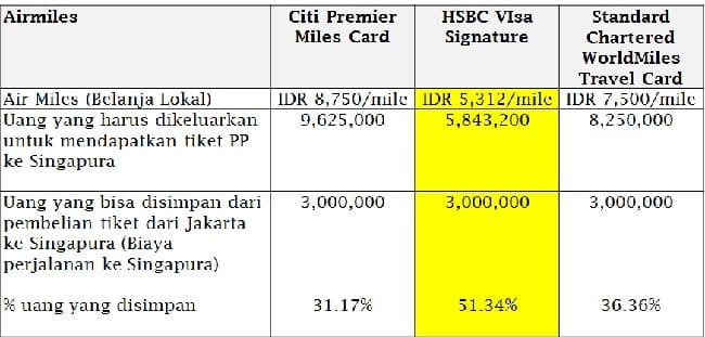 Harga airmiles untuk Citi Premier mencapai Rp 8,750 per mil sementara HSBC Visa dan Standard Chartered Worldmiles masing-masing yaitu Rp 5,312 per mil dan Rp 7,500 per mil. (Lihat table)